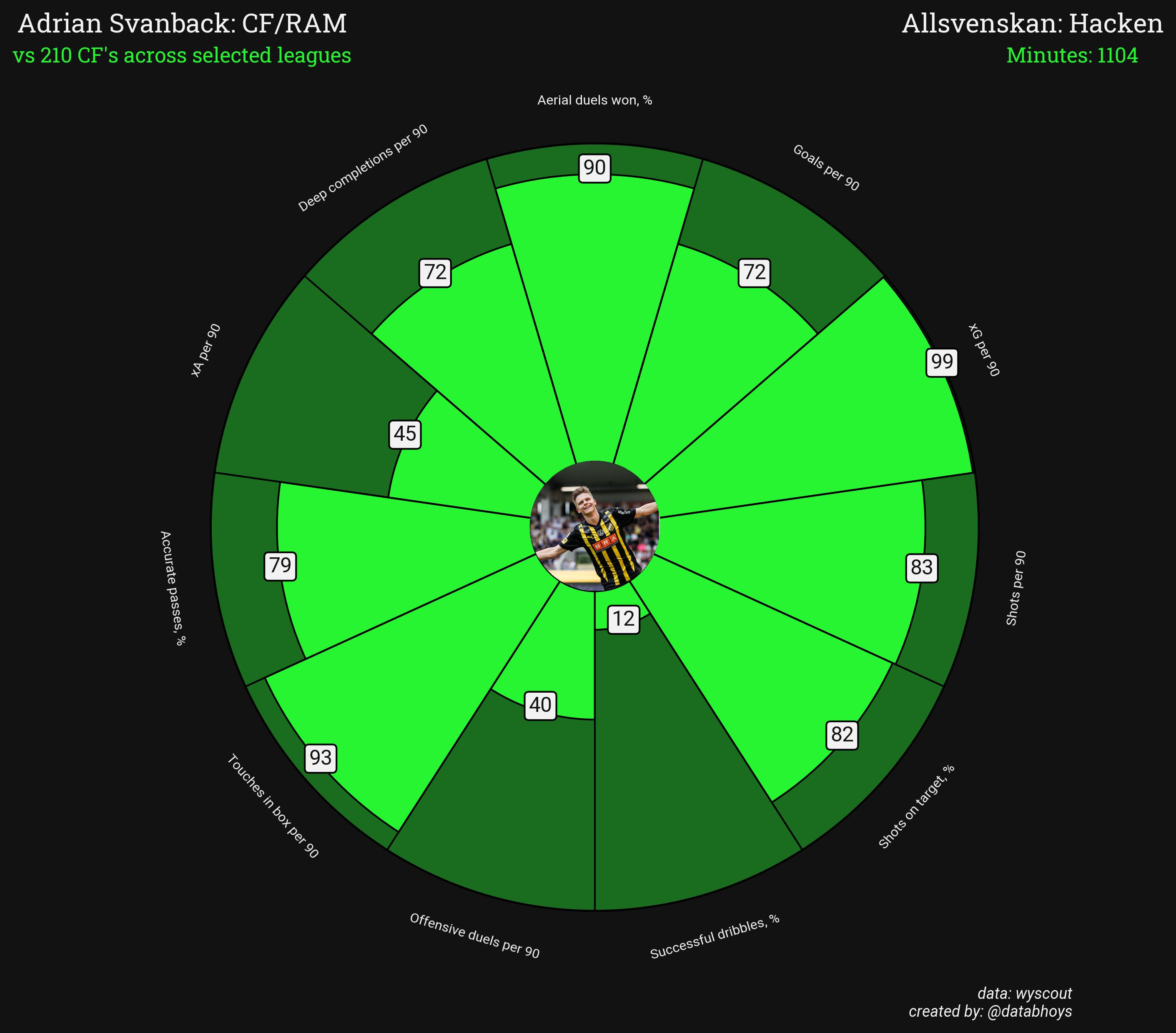 72nd percentile for goals per 90 isn’t outrageously good, but 99th percentile for xG per 90 certainly is and evidences that he knows how to get himself into great shooting positions. 90th percentile for aerial duel success rate indicates someone who is aerially dominant – and 93rd percentile and 72nd percentile for touches in the box per 90 and deep completions per 90 respectively suggests he can get himself in the box but also find other players in the box.