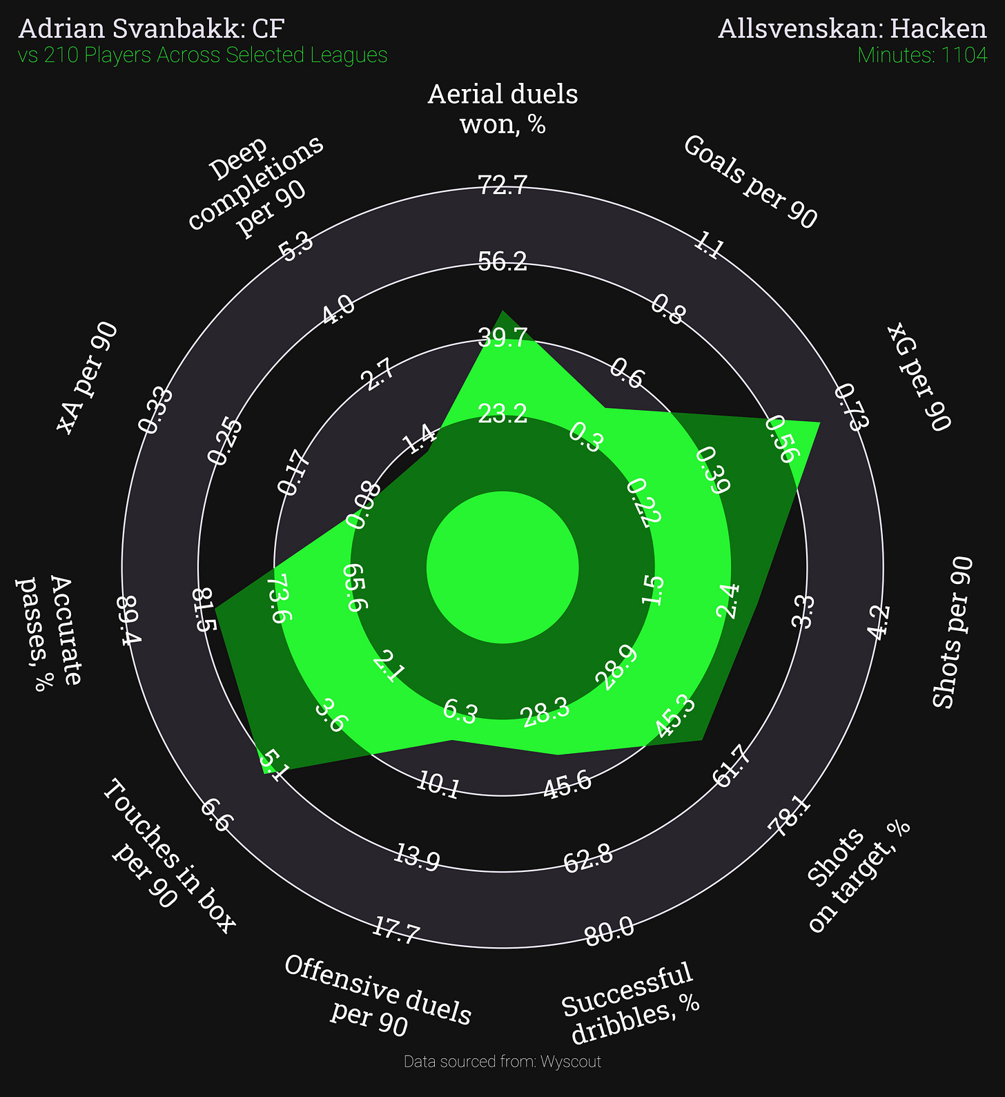 Svanback is a Finnish forward, only 21 years of age and currently playing for Hacken in Sweden. He signed for Hacken only in the summer of 2025 after breaking through at Helsingborg. He is a little different as despite featuring mostly as a CF, he also has some minutes playing out on the right. This may explain why his scoring prowess is not as outstanding as the other players we are looking at, but it is in the other areas of his game I think he could have real value.