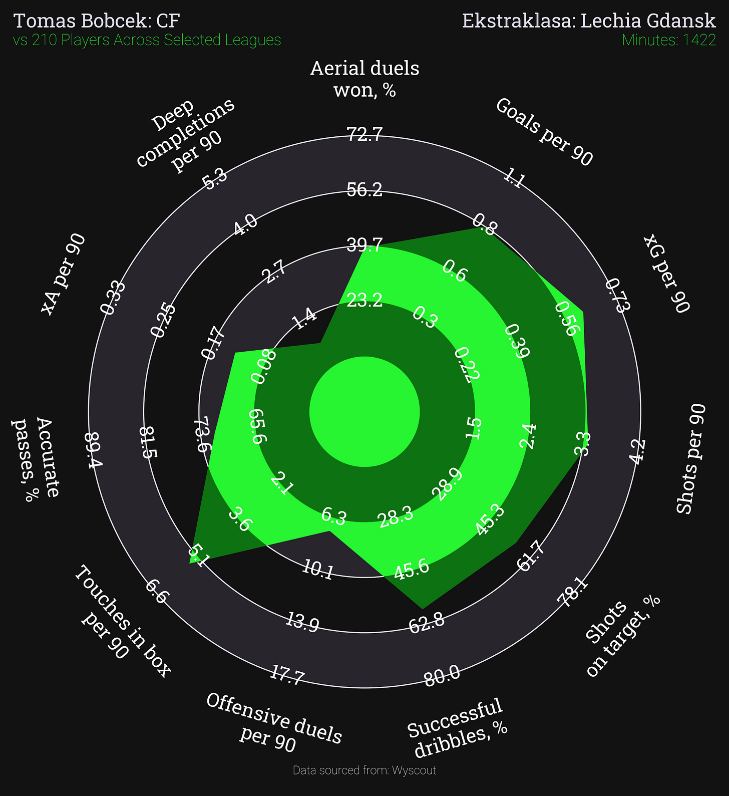 Tomas Bobcek is 24 years old, 6 ‘ 1” tall currently playing for Lechia Gdansk in Poland, where this season he has scored 13 goals in 17 appearances – a goal every 101 minutes. He stands out massively in this dataset of over 200 players, being in the 99th percentile for goals per 90 and shots taken, 97th for xG per 90, 94th for touches inside the box, 88th for shots on target %, 81st for dribble success % - basically, he’s on absolute fire. He may also have some creative value, being in the 74th percentile for xA per 90. He shows up as potentially a complete forward, a profile that would be a massive help in the way we are trying to play under Wilfried Nancy.