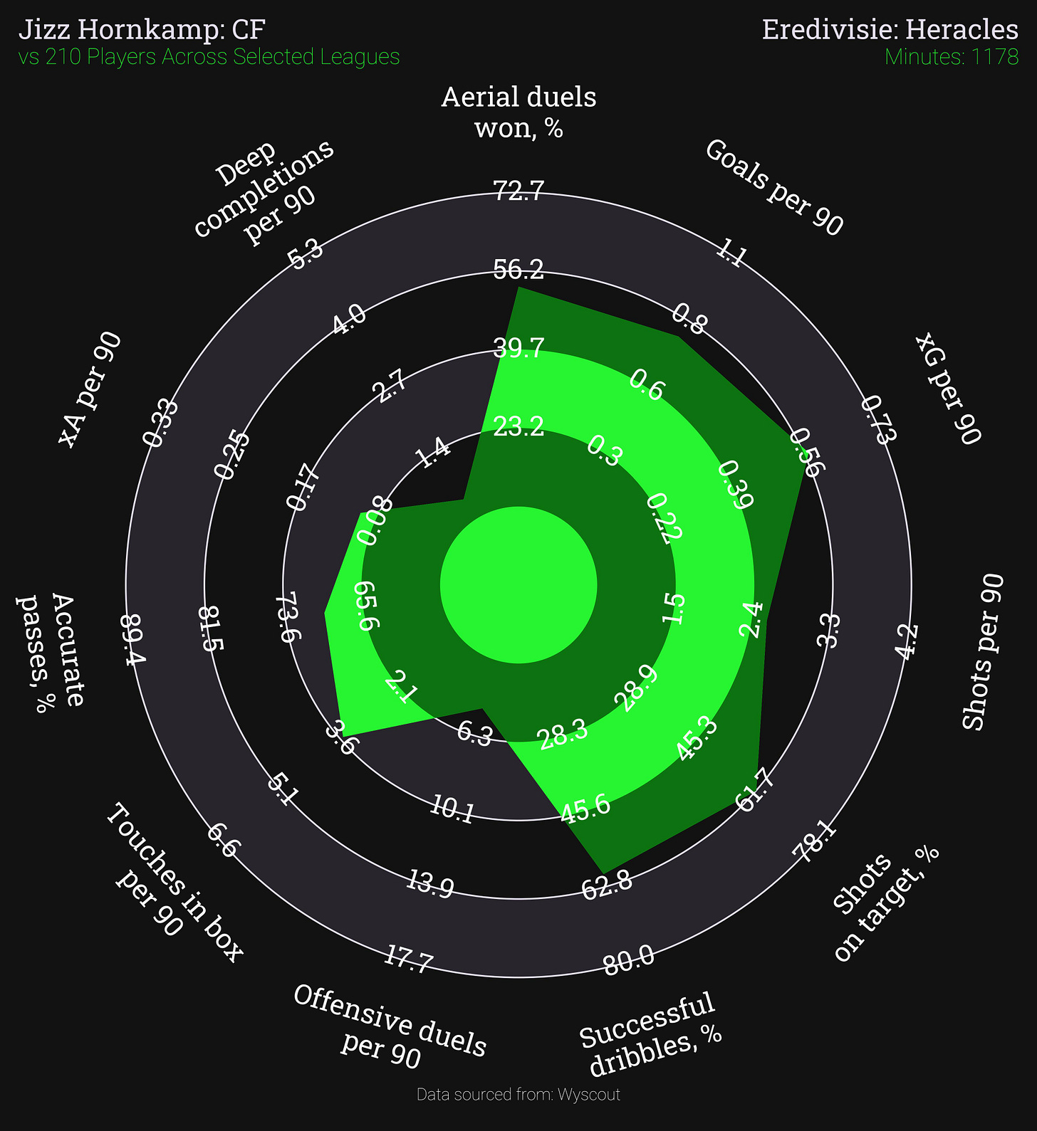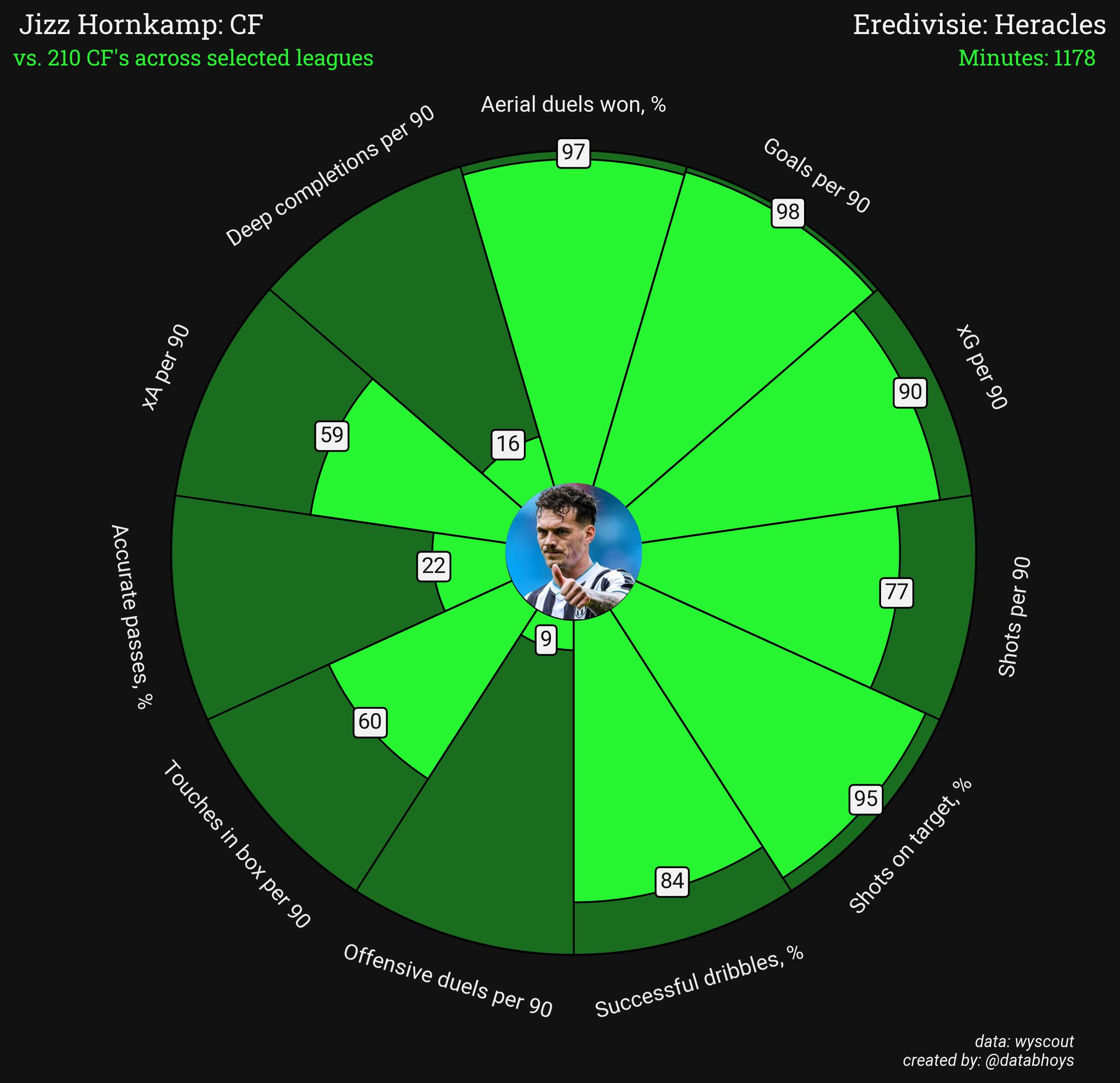 Aside from the fact that having a striker named Jizz would be funny in a very juvenile way, Hornkamp has a bit more experience than the other strikers we are looking at. 27 years old and spending his entire career in the Netherlands, he has mostly scored goals at 2nd division level but this season has managed to translate that to top flight football for Heracles with 10 goals in 13 appearances, averaging a goal every 117 minutes. 98th percentile for goals per 90, 90th percentile for xG per 90, 95th percentile for shots on target % – but his aerial ability is probably his super strength, being in the 97th percentile for success rate in aerial duels. 84th percentile for dribbling success rate also suggests a decent propensity to keep control of the ball when travelling with it.